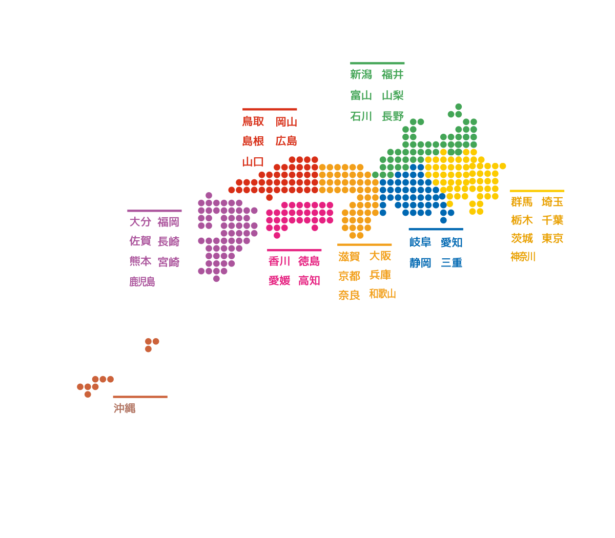 ・中部地域 - 愛知県、岐阜県、三重県 ・北陸地域 - 福井県、石川県、富山県 ・関西地域 - 大阪府、京都府、兵庫県、滋賀県、奈良県、和歌山県 ・中国地域 - 鳥取県、岡山県、山口県、島根県、広島県 ・四国地域 - 香川県、徳島県、愛媛県、高知県 ・九州地域 - 福岡県、長崎県、佐賀県、熊本県、大分県、宮崎県、鹿児島県